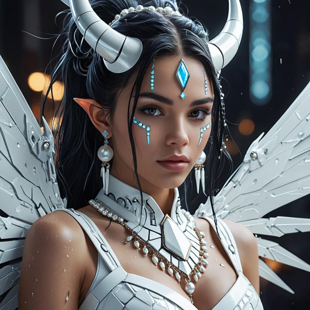 A pale demoness with white hair tied into a bun, horns, she has one tusk, wearing an oversized sweater with morb written on her chest. highly detailed, digital painting, artstation, matte, by makoto shinkai, animation style