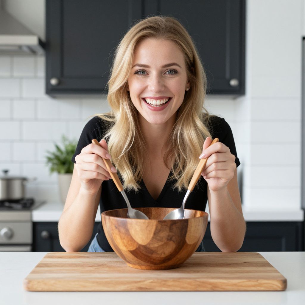 Blonde woman smiling brightly while holding two spoons over a wooden bowl, set on a light wooden cutting board in a modern kitchen with white subway tiles and dark cabinets.
