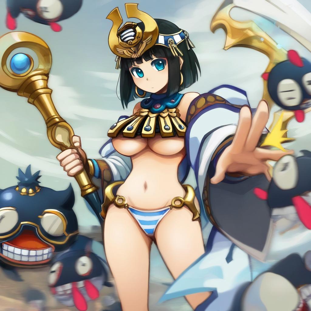Ankha (animal crossing), animal crossing, 1girl, cat girl, furry female, yellow skin, cat ears, cat tail, striped tail, black eyes, blue eyes, short hair, blue hair, blonde hair, snake hair ornament, bob cut, blunt bangs, large breasts, yellow fur, body fur, by artist f.s., leet
