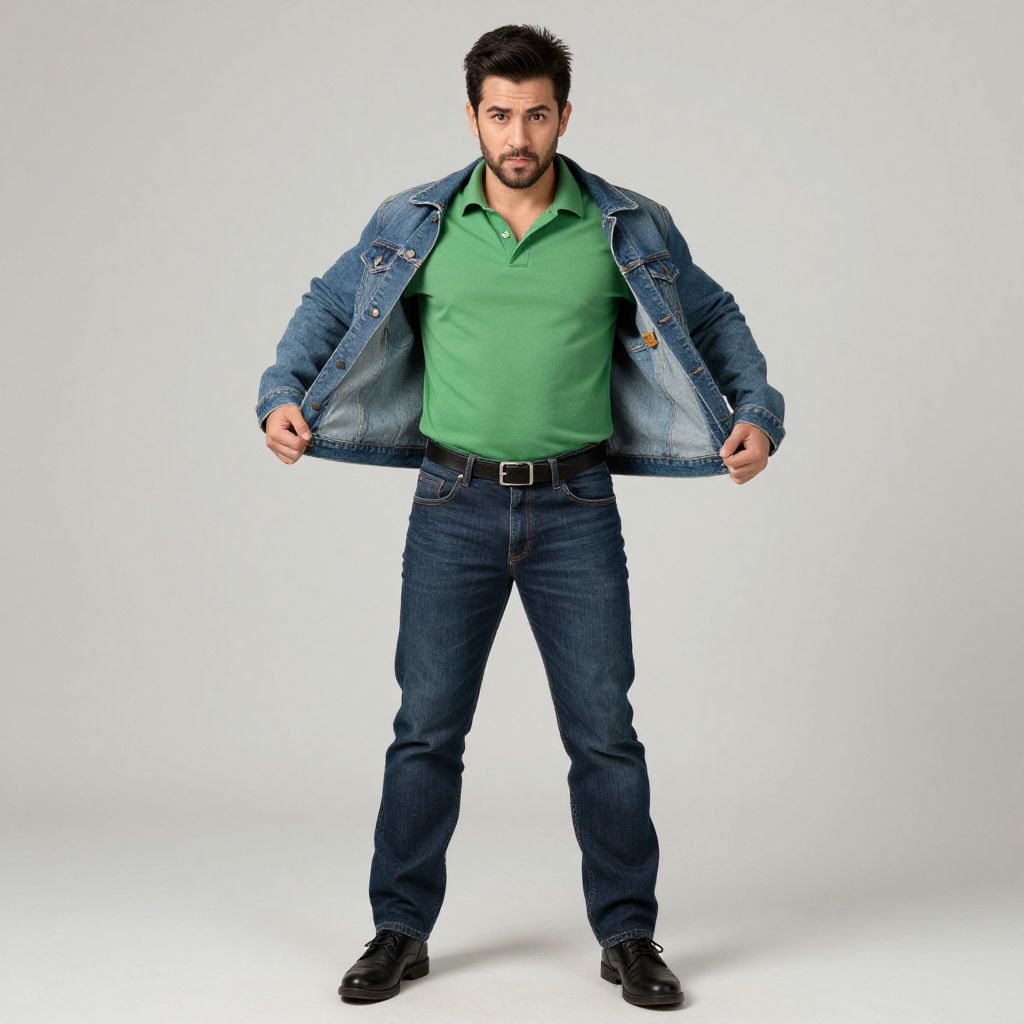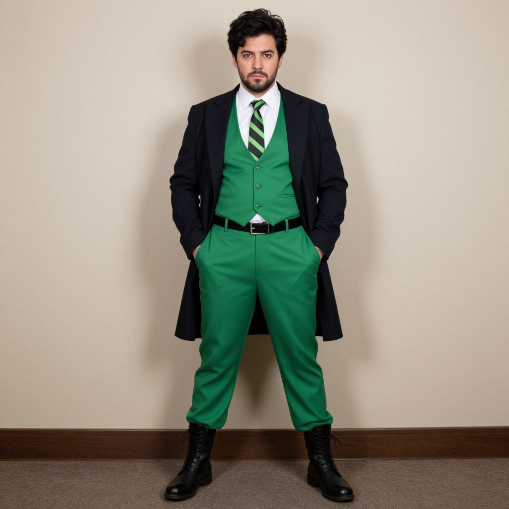 "plus size riddler costume, 1boy, male focus, solo, hands in pockets, standing, full body, pants, boots, necktie, looking at viewer, shirt, coat, belt, facial hair, vest, closed mouth, black hair, jacket, green pants, open clothes Realistic photo of casual sexy person with pretty face"