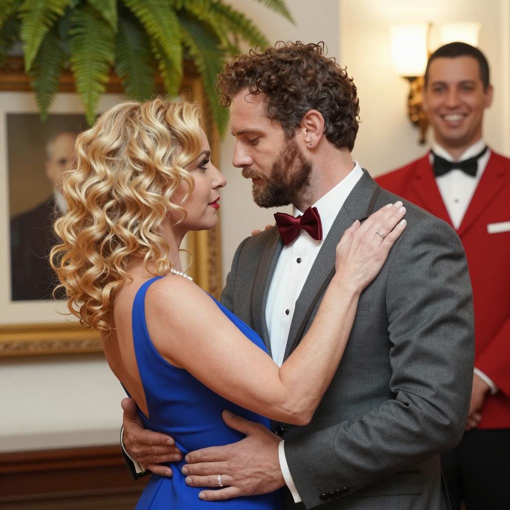 Man in gray suit with red tie and mustache, holding woman's chin, stands in front of her. Woman with wavy brown hair, wearing black dress with pearl necklace, looks up at him. Background: living room with wall sconces, patterned chair, and kitchen in the back. Both standing close, man's right hand on her neck. Warm lighting.