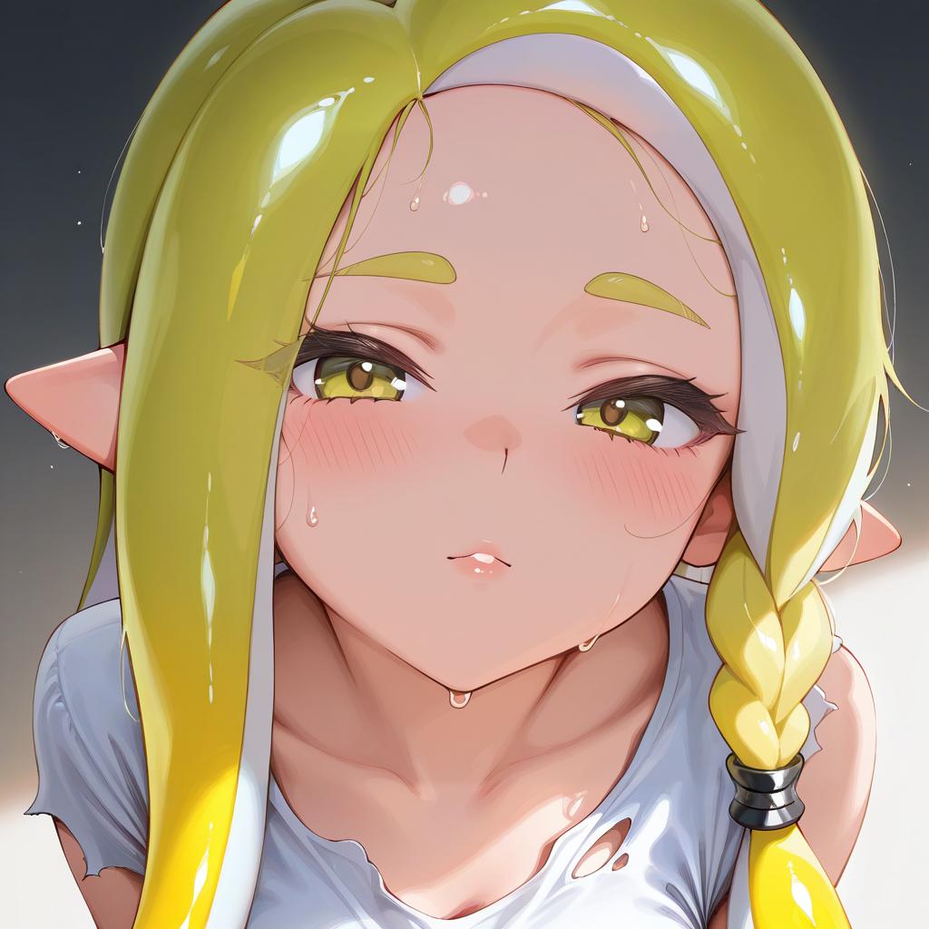 Agent 3 (splatoon 3), splatoon (series), 1girl, pointy ears, yellow eyes, eyebrow cut, tentacle hair, blonde hair, long hair, asymmetrical hair, single braid, side braid, torn shirt, by artist ame (uten cancel), illustrious
