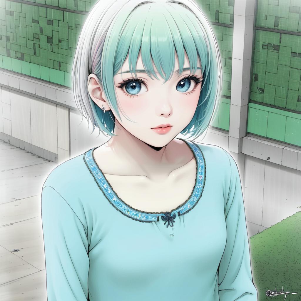 Illustration of a young anime girl with short, light blue hair and large aqua blue eyes. She is wearing a light green V-neck long-sleeve top with a darker green collar. The background features vibrant, colorful abstract stripes in green, blue, pink, and black. The girl has a soft expression and visible collarbones, with a style inspired by the artist Ruukii Drift.