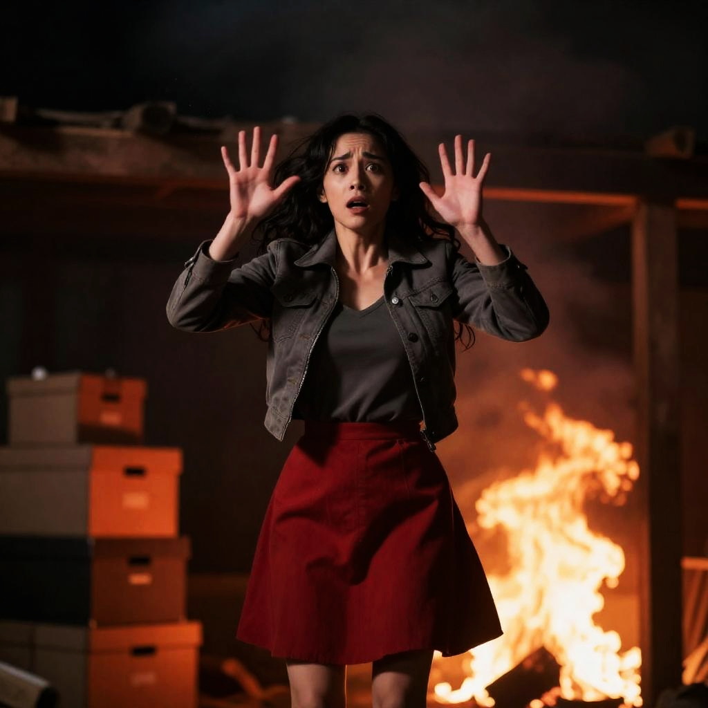 Woman with long black hair, gray jacket, red skirt, mid-air, hands up, frightened expression. Background: fire, wooden beams, stacked boxes. Filmic, dim lighting, intense scene.