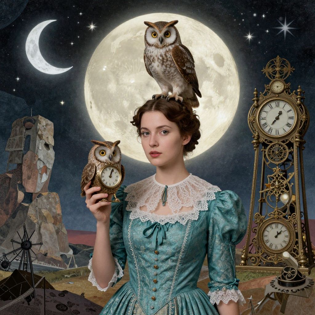 Surreal portrait of a woman in a detailed teal dress with a lace collar, holding a small clockwork owl while another owl perches on her head. The background features a large glowing moon, crescent moon, stars, and an abstract rocky landscape with a tall ornate clock. The scene blends elements of fantasy, steampunk, and dreamlike aesthetics inspired by Max Ernst's collage style.