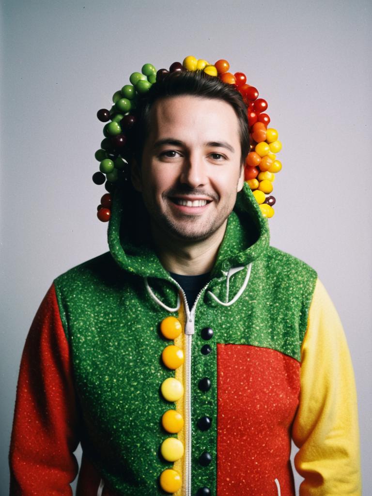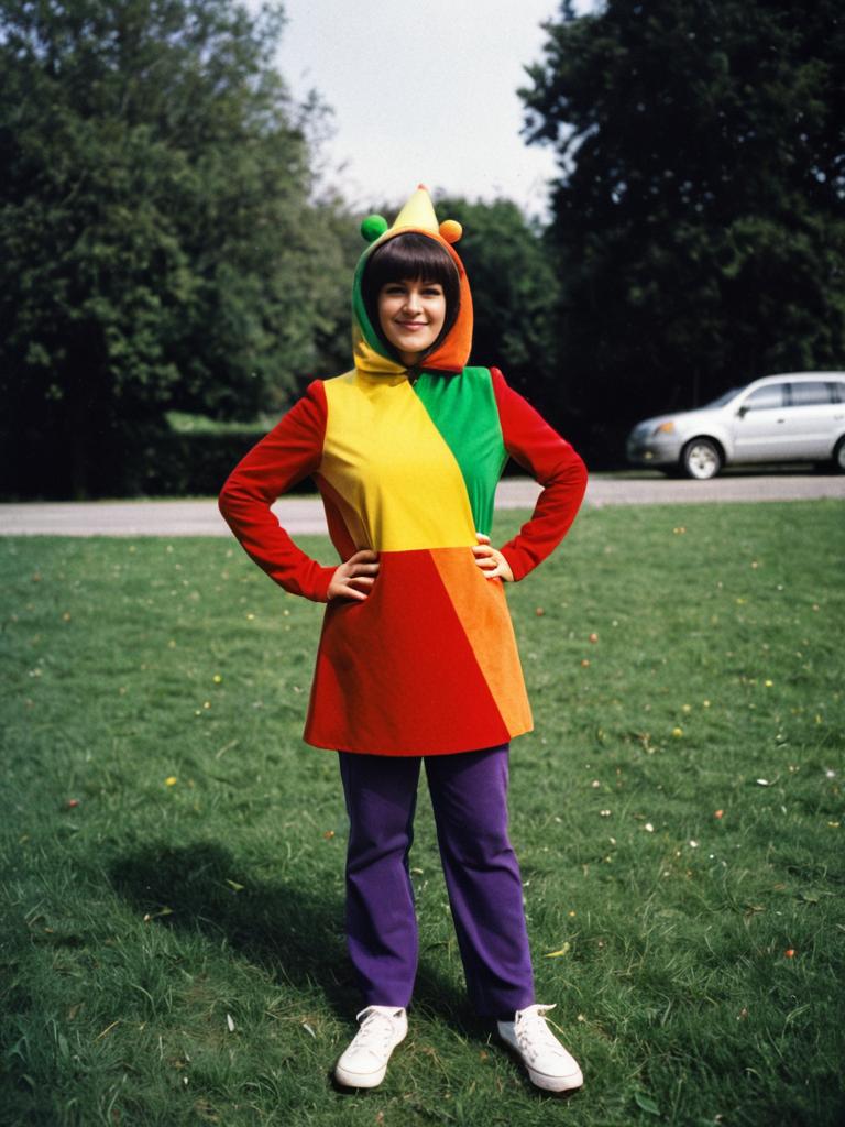 Person in Skittles Costume, photorealistic outdoor portrait, natural daylight