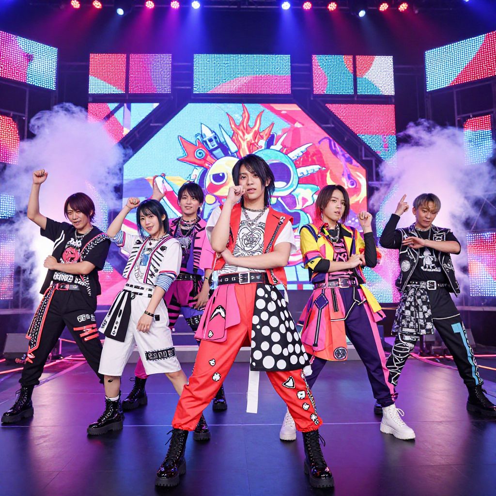 Photograph of five Asian male performers on stage, wearing vibrant, patterned outfits. Center performer in red pants with white polka dots and yellow sleeves strikes a dynamic pose. Left and right performers in black and white outfits with bold graphics raise their fists. Two back performers in white and black outfits also strike energetic poses. Background features colorful LED lights and smoke, with a large, bright graphic of an explosion. Stage lights in blue and pink illuminate the performers. All wear black boots and belts, creating a high-energy, modern, and edgy vibe.