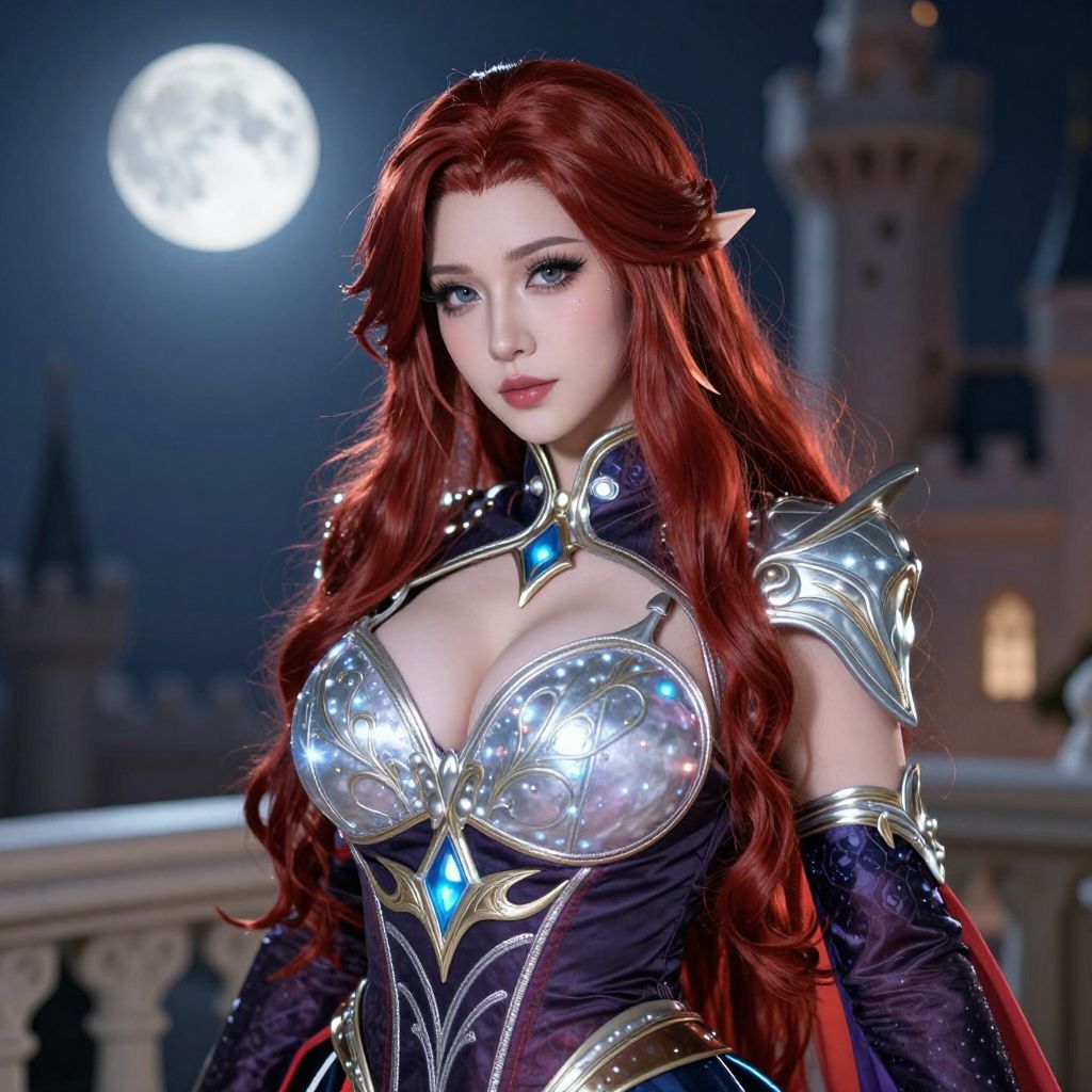 A high-resolution photo of a long red hair woman wearing a bold, fantasy-themed costume with silver embroidery and glowing magical elements, posing confidently on a moonlit castle balcony, her face glowing with serene intensity, strong cheekbones, and long lashes, the red hair cascading over her shoulders and back, reflecting the soft light from the moon.. The woman has big tits and cute face