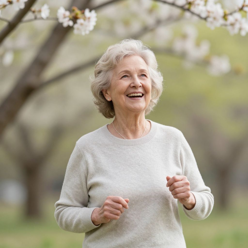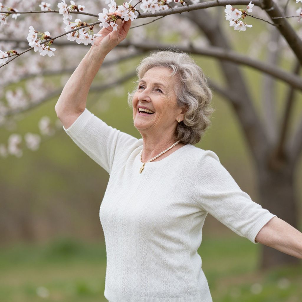 Radiant serenity blooms in the gentle embrace of spring, as a senior woman’s laughter dances through the air, weaving threads of timeless joy and youthful spirit amidst the verdant whispers of nature.