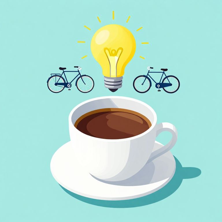 Victorian Aesthetics Isometric art of a cup of coffee,with bikes and ideas flowing, dreamy summer color palette, aestehtic, minimal design,