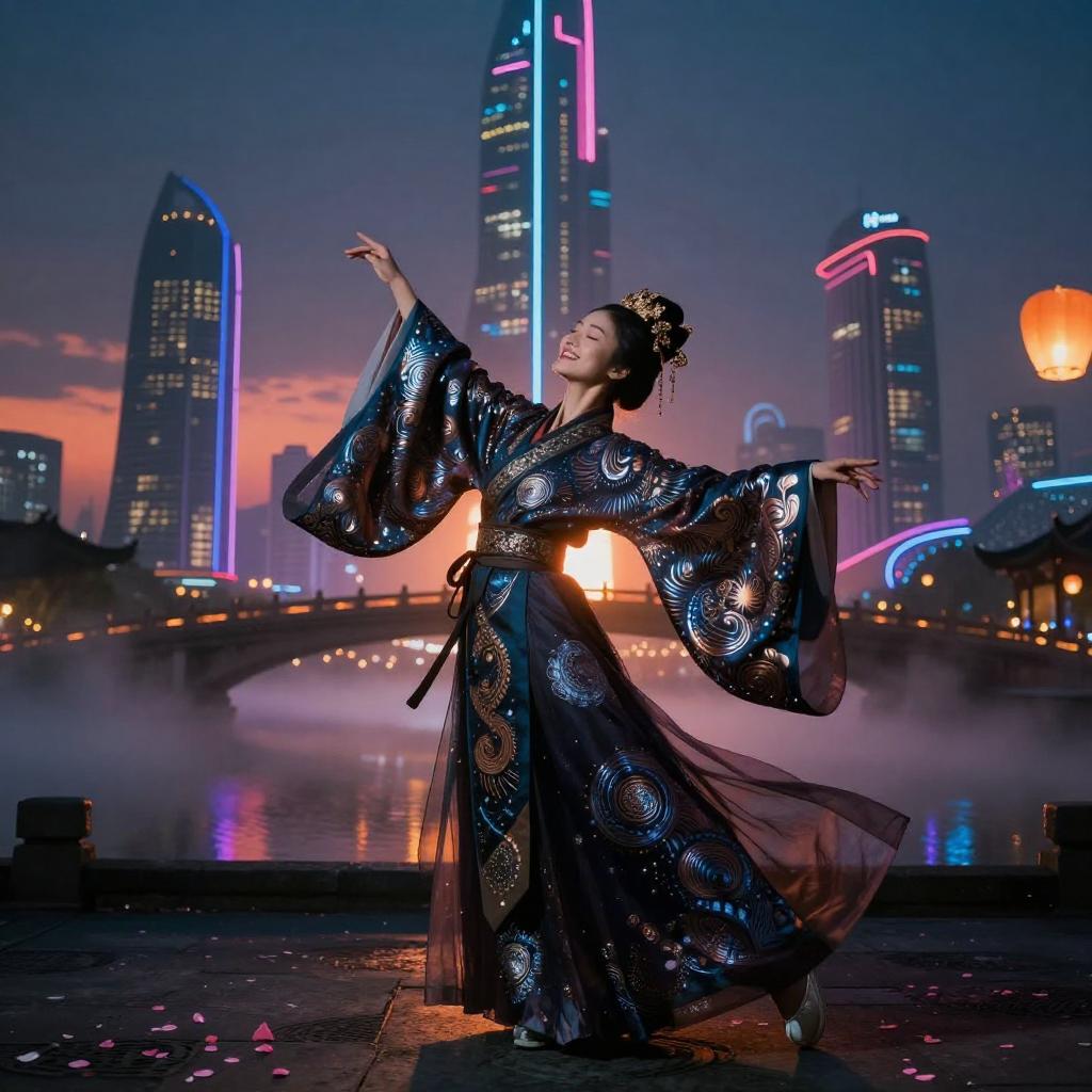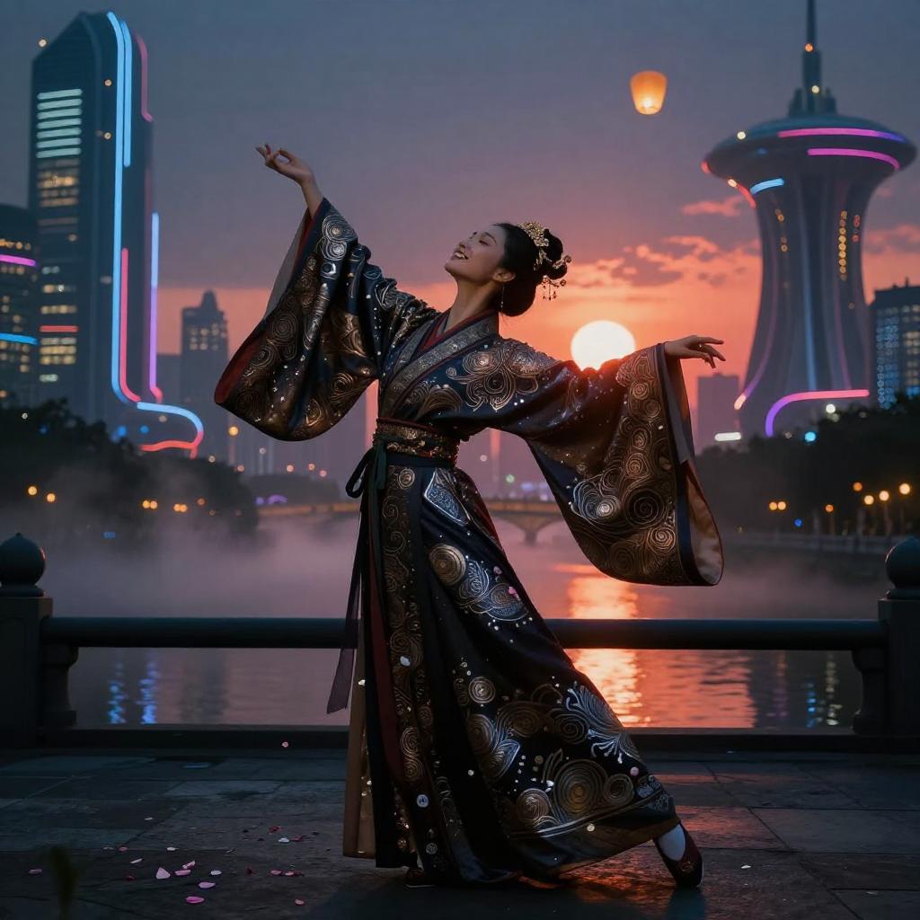 Best quality, masterpiece, ultra high res, raw photo, beautiful and aesthetic, deep shadow, dark theme, (photorealistic:1.4), masked Noh dancer, wearing flowing Hanfu with metallic filigree, soft smile, open mouth, closed eyes, ((chiaroscuro, backlight, sunset, petals floating)), graceful poise, evocative atmosphere, magnetic presence, captivating mystique, intricate zentangle patterns, astonishing level of detail, striking perspective, a chaotic masterpiece balanced by harmony, vibrant color palette, ((outdoors)), fog-laced river bridge beneath a neon futurist skyline with floating lanterns, inspired by futurist architecture