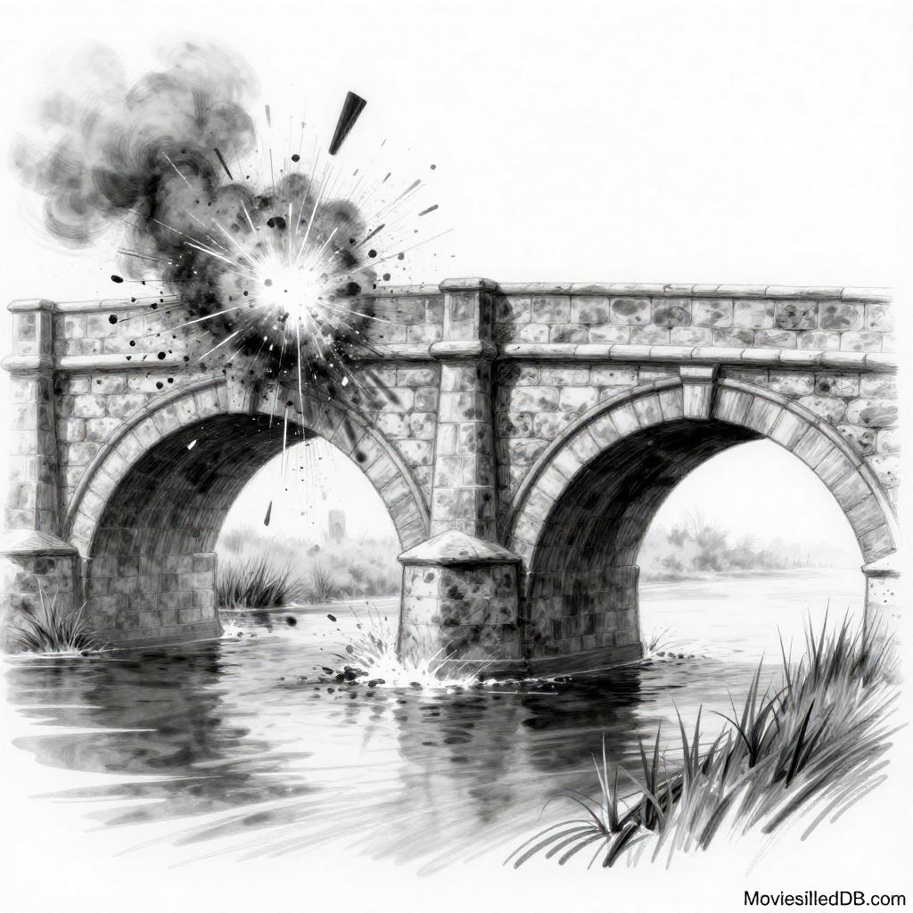 Black-and-white digital drawing of a stone bridge with two arches. Explosive debris and smoke burst from the left arch, splashing into the water below. The right arch remains intact, with grass growing at its base. The artist's , "MoviesilledDB.com," is in the bottom right corner.