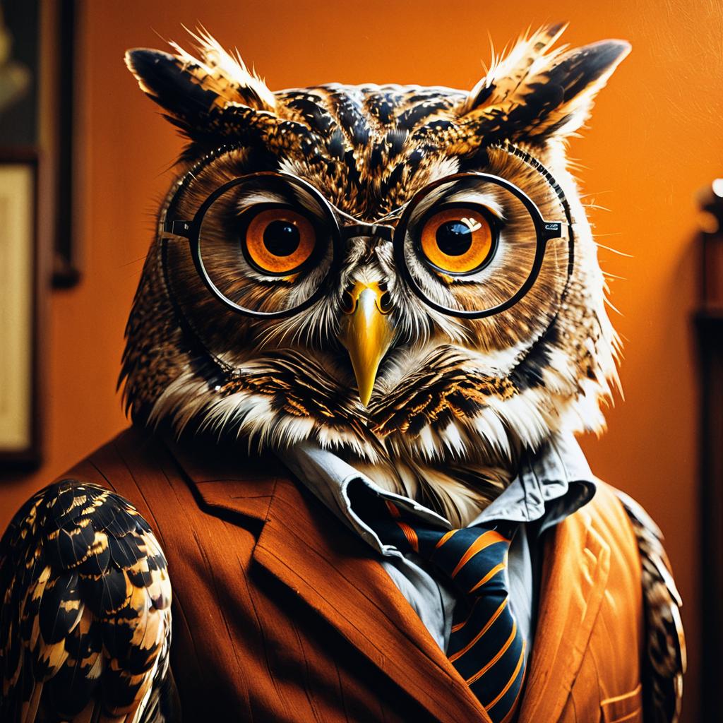 Stoic, renaissance-inspired owl bard in classic Italian renaissance fashion with a baroque art influence. The portrait is rendered in hyper-realism with earthy muted tones and influenced by Domenico Ghirlandaio, Pietro Longhi.