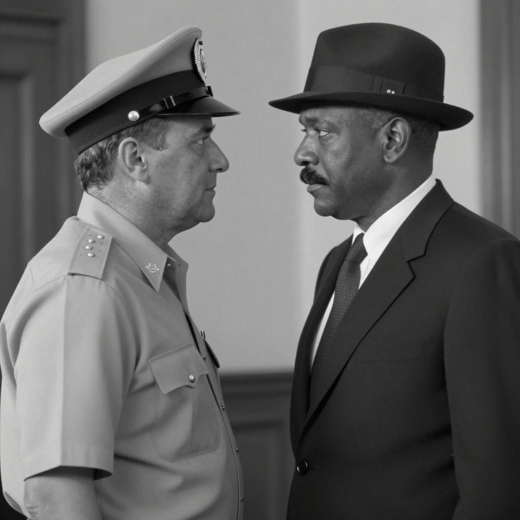 Black and white photograph of two men standing face to face indoors. The man on the left wears a light-colored uniform shirt with shoulder insignia and a peaked cap, has a round face with short dark hair. The man on the right wears a dark suit, white shirt, dark tie, and a black fedora hat, has a mustache and a serious expression as he looks at the other man. The background is blurred, focusing on the intense interaction between the two men.