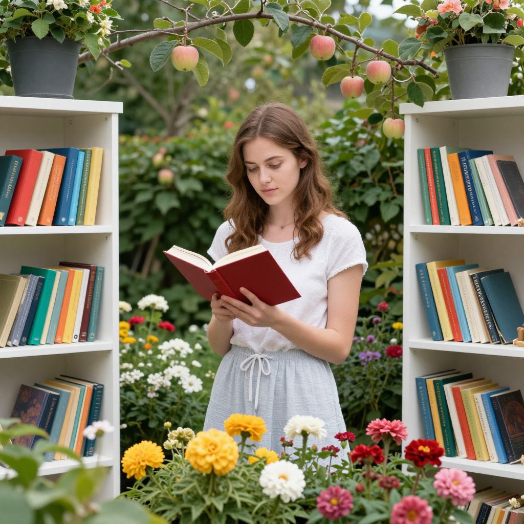 A young woman stands amidst a vibrant garden, surrounded by blooming flowers and lush greenery, while reading a red book held open in her hands, with bookshelves filled with colorful volumes flanking her on either side and apple fruits hanging from branches above.