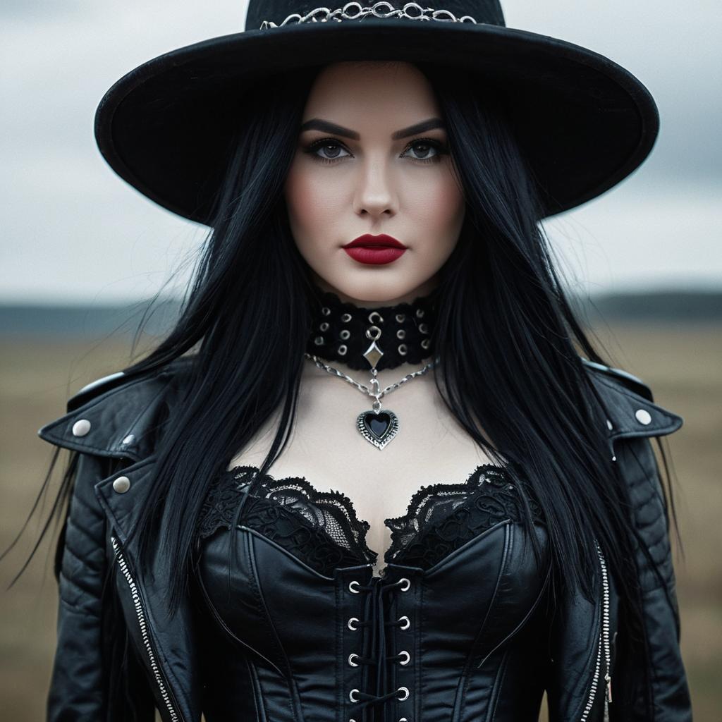 Goth outfit, photorealistic, young woman, gothic style, black leather jacket, black lace-up corset, black choker necklace, silver pendant, large black wide-brim hat with lace trim, long black hair with red streak, pale skin, serious expression, blue eyes, blurred outdoor background, overcast lighting, focus on face and upper body, detailed ures, dark and moody atmosphere, close-up portrait, realistic digital painting