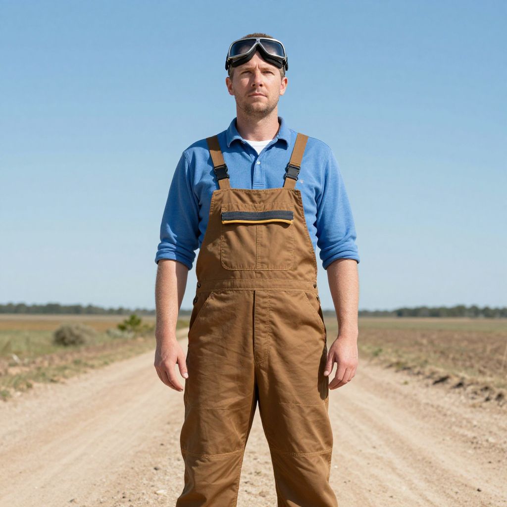Man wearing brown overalls and a blue shirt with a pair of goggles on his head. He is standing on a dirt road with a clear blue sky.