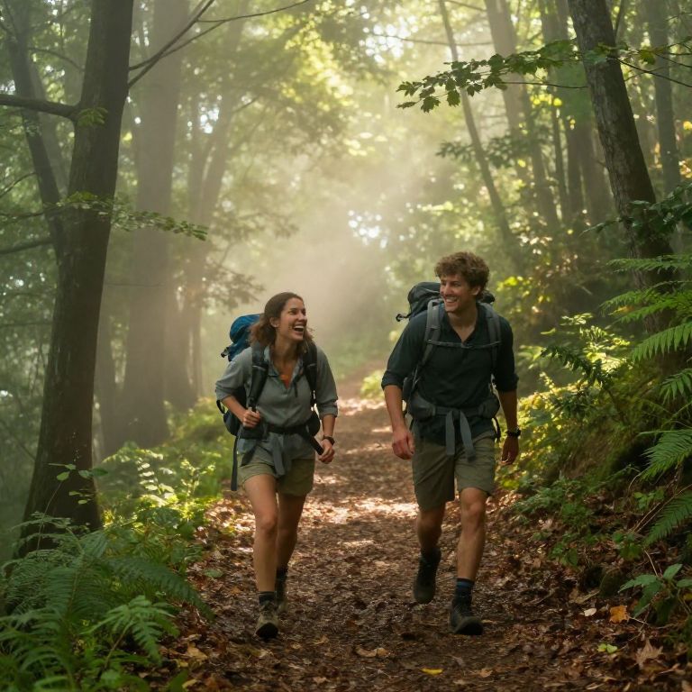 Two friends hiking through a misty forest trail, backpacks on, laughing, sunlight filtering through trees, ambient sounds implied, vibrant greens and warm tones, dynamic movement, cinematic depth, natural landscape, Flux style.