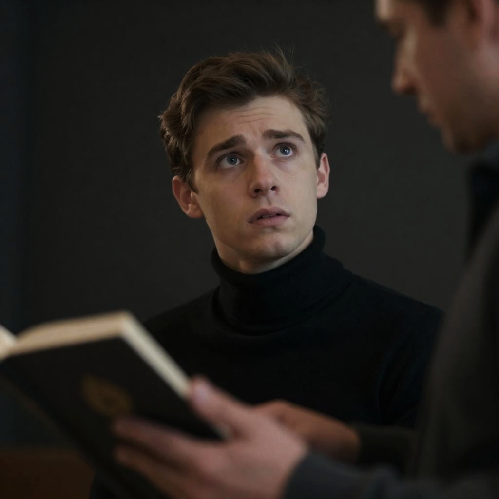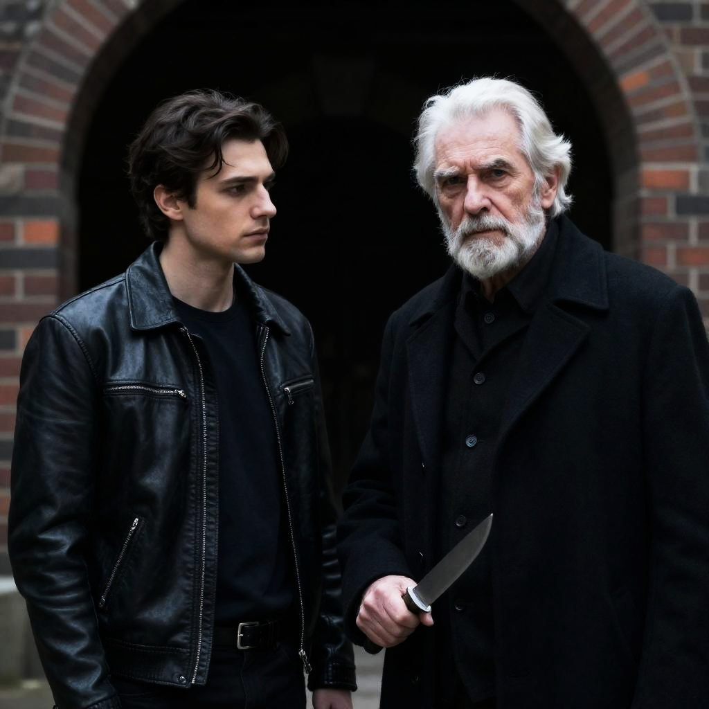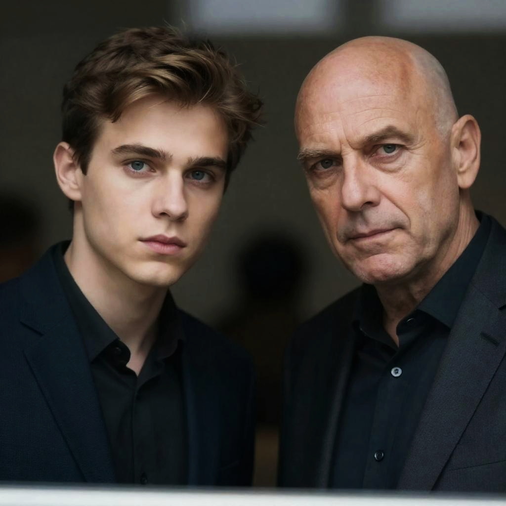Photograph of two men in dark setting. Older man with gray mustache, wearing checkered coat and brown hat, intense expression. Younger man with short brown hair, wearing dark coat and tie, serious expression. Both seated, facing forward.
