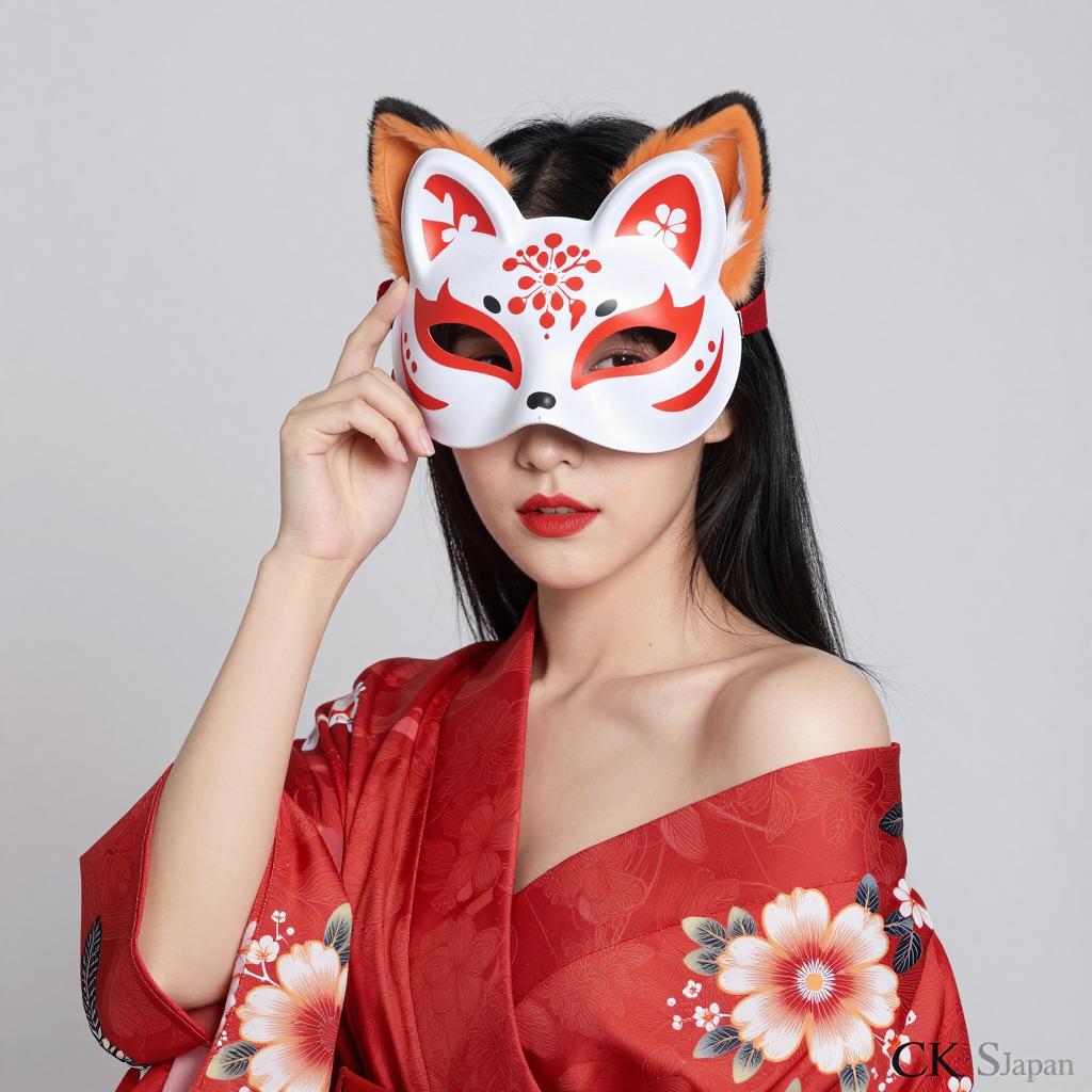 Asian woman with light skin, wearing a black jacket and a white fox mask with red markings, holding the mask's stick. Brown hair in a side ponytail with a black floral hairpin. Background: black and white banner. CKS-JAPAN in the top left.