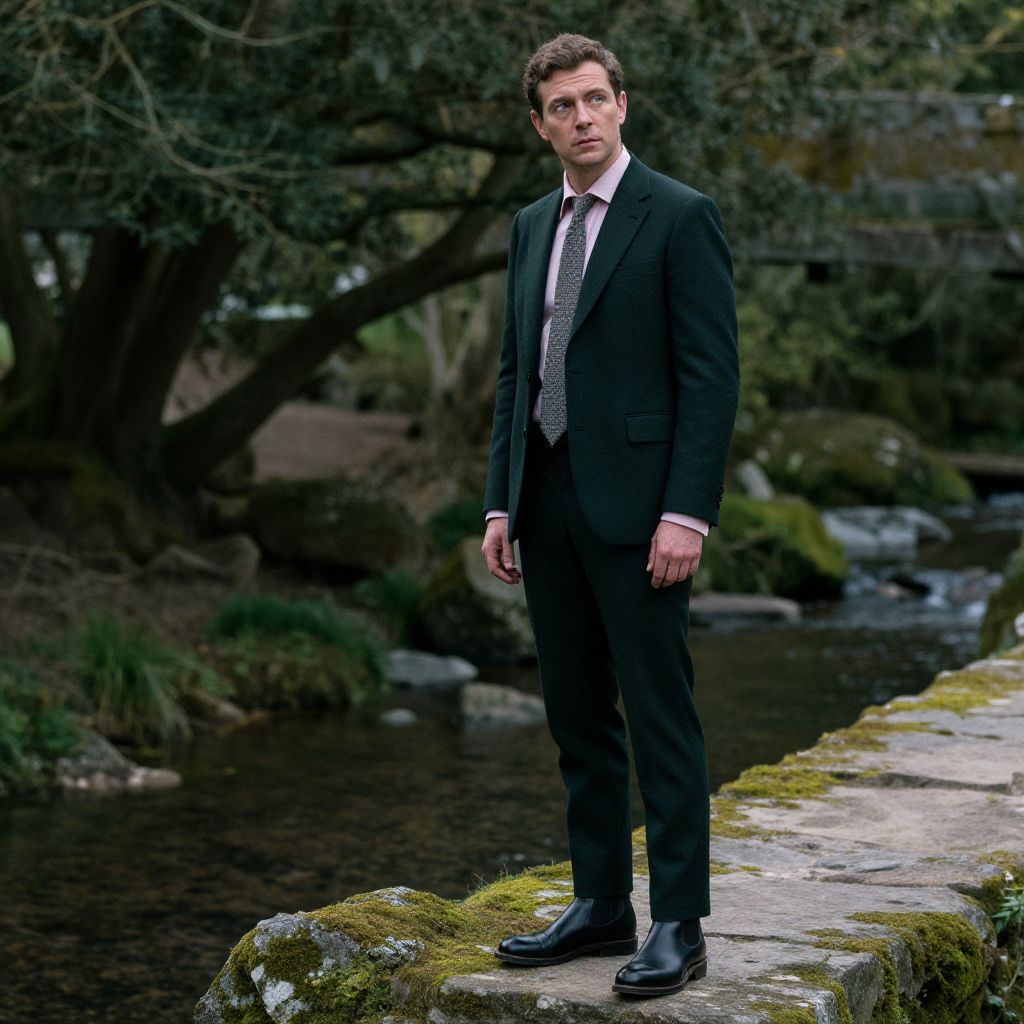 A man, dark green suit, pale pink dress shirt, textured gray tie, black leather Chelsea boots, standing on an ancient stone bridge, overgrown with moss, tranquil stream flowing beneath, soft light filtering through trees, contemplative expression, cinematic film style. Man has masculine face and piercing eyes