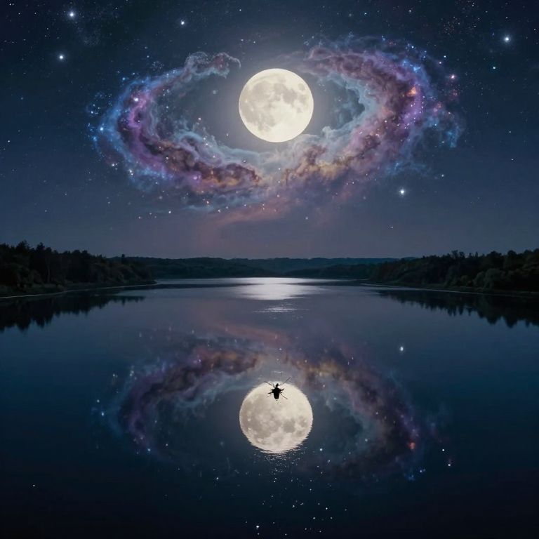 A dreamlike landscape unfolds under the soft illumination of a full moon, as seen from an aerial vantage point by a celestial insect. This enchanting scene blends the fluidity of impressionist techniques with the magical allure of fantasy art, depicting a tranquil lake reflecting a sky adorned with swirling galaxies and nebulous formations. The camera angle is elevated above the water's surface, offering a captivating perspective on the interplay between liquid reflections and cosmic constellations as they dance together in an alluring ballet of light and color. This celestial portrait captures the profound beauty of the universe while evoking an emotional spectrum ranging from serenity to awe, inviting viewers into a world where dreams take flight.