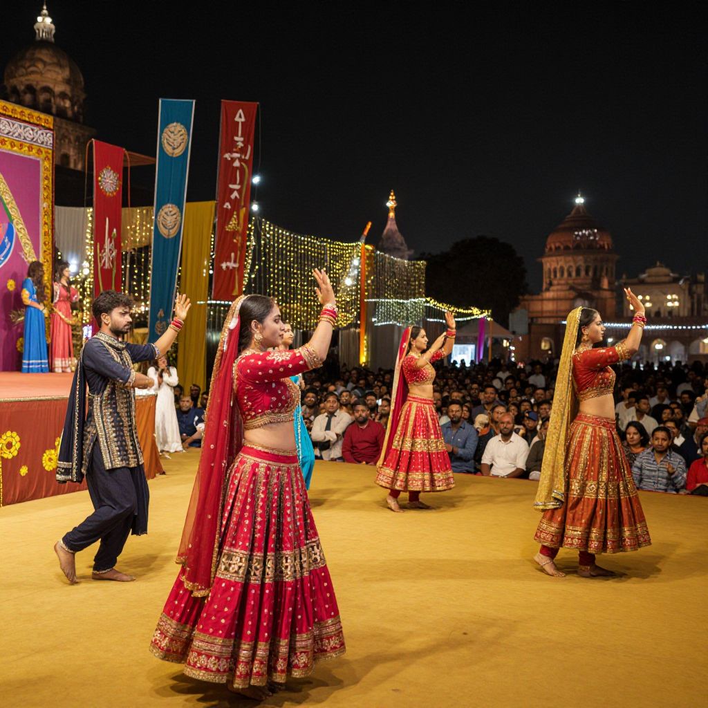 Delhi cultural festival scene with traditional dancers in vivid costumes performing on a decorated stage, surrounded by enthusiastic crowd, vibrant banners and fairy lights illuminating the night, iconic historical monuments faintly visible in the background