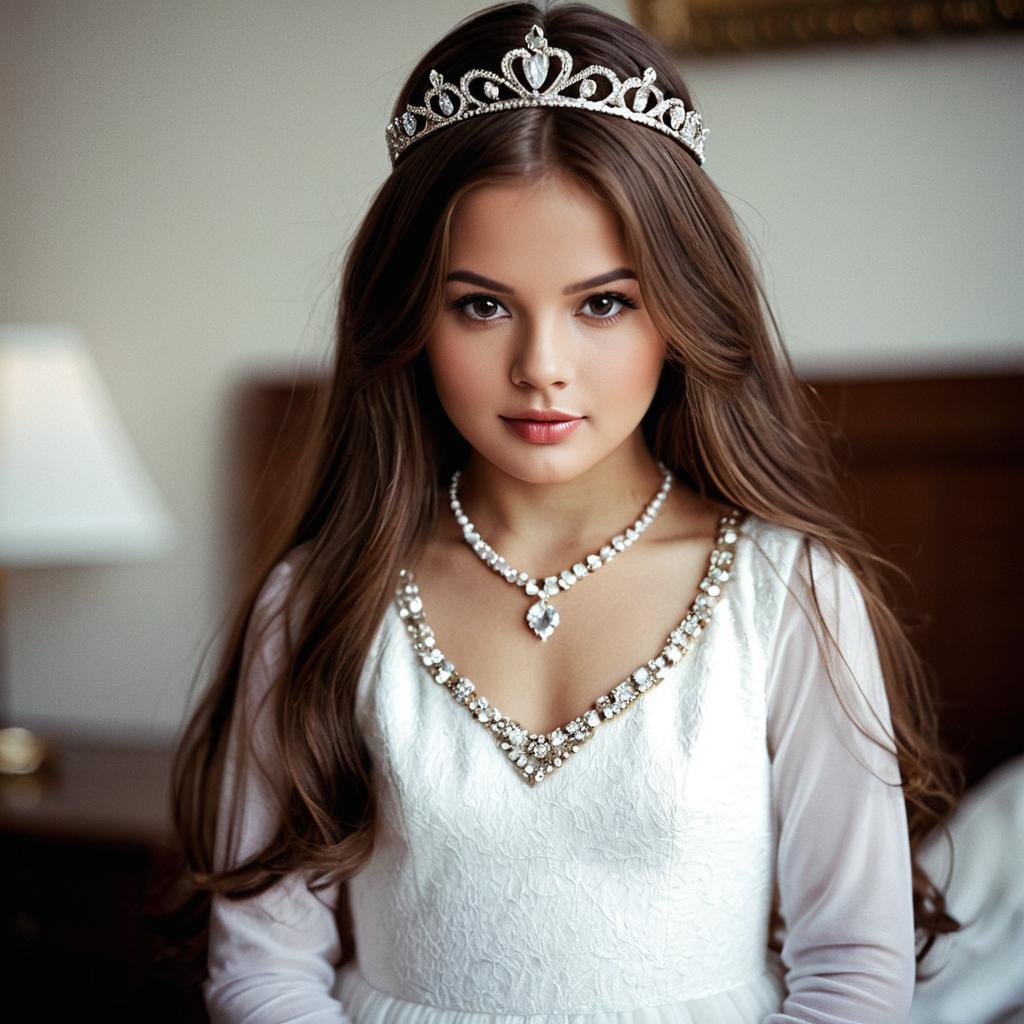 Portrait of a young girl with long brown hair and freckles wearing a white dress with puffy long sleeves and pearl buttons. She is adorned with a gold crown decorated with jewels and is looking directly at the viewer. The background includes blurred elements suggesting an indoor setting with traditional decoration.