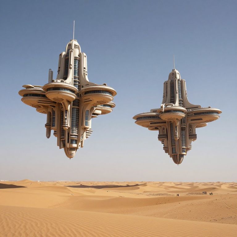Photograph of two futuristic, floating spacecraft with sleek, white, cylindrical designs and multiple circular modules, hovering above a vast, sunlit desert with rip