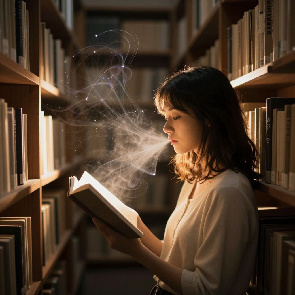 Photograph of a young woman with dark hair reading a book in a dimly lit library, with ethereal light trails emanating from the book.