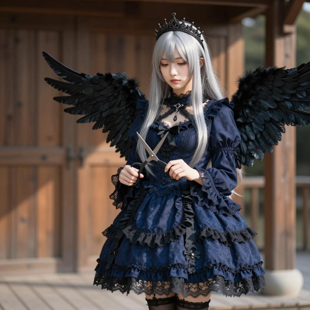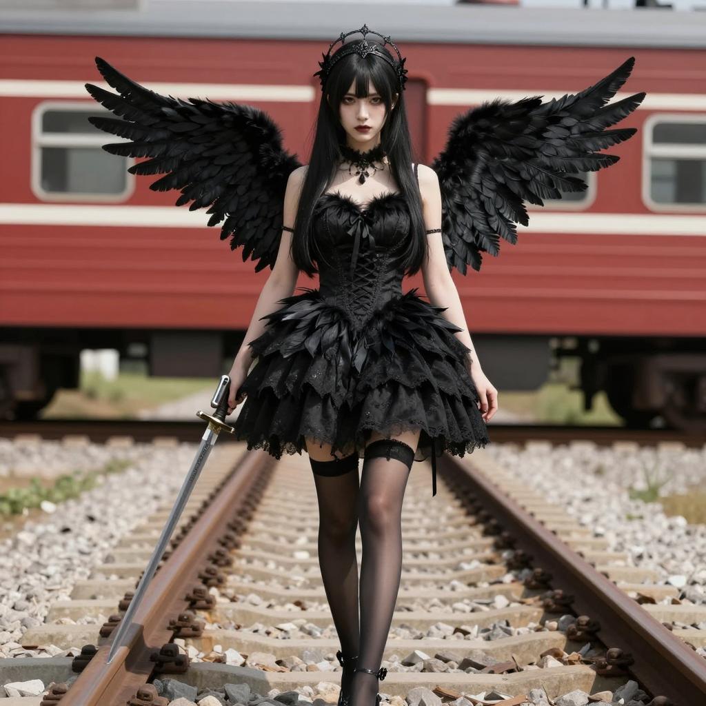 Gothic anime-style photograph of a woman standing on a railway track. She has long black hair, wears a black feathered dress with multiple ruffled layers, black wings, and a headpiece. She holds a gun in her right hand and a sword in her left. She has pale skin and a serious expression. She wears black stockings and shoes. The background features a red and white train car with tracks and greenery. Sunlight illuminates the scene from the right.