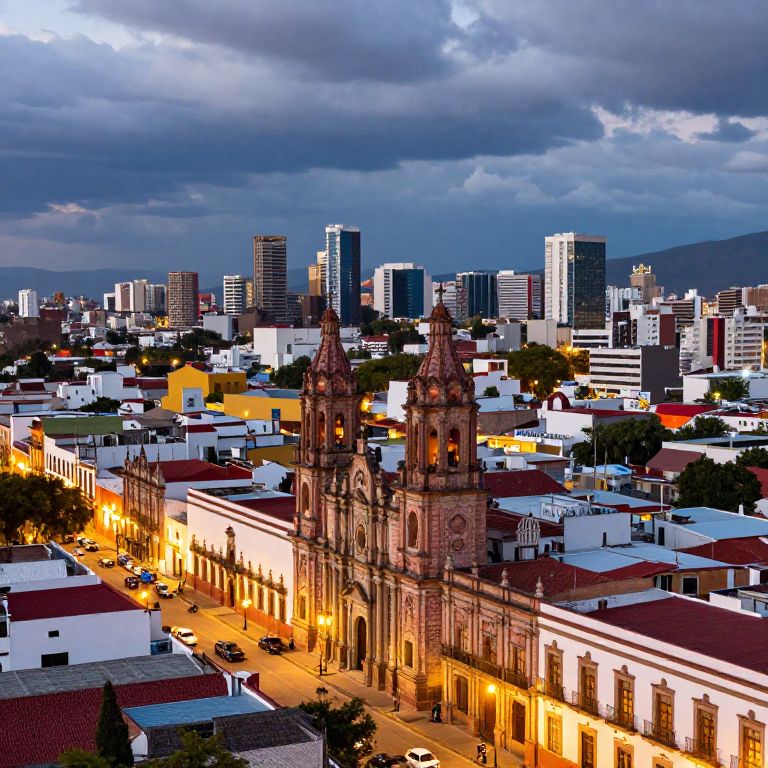 Jalisco, panoramic view of Guadalajara cityscape at dusk, historic colonial buildings with ornate facades, modern skyline blending with old town charm, glowing streetlights, vibrant urban life, dramatic clouds overhead, detailed architectural elements