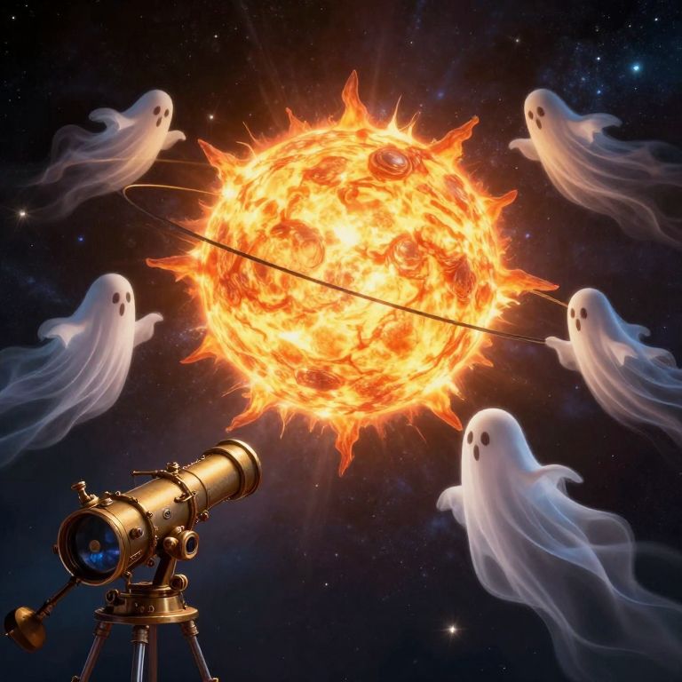A digital illustration depicts a bright, fiery sun at the center of a dark, starry space. Six white, ghostly, floating figures surround the sun, each with simple, black, circular eyes. A brass telescope with a black eyepiece is positioned in the bottom left corner, pointing directly at the sun. The sun's intense orange and yellow flames contrast sharply with the dark blue and black background. The ghosts have ethereal, flowing forms and appear to be interacting with the sun, creating a mystical, otherworldly atmosphere. The image combines elements of science and fantasy.