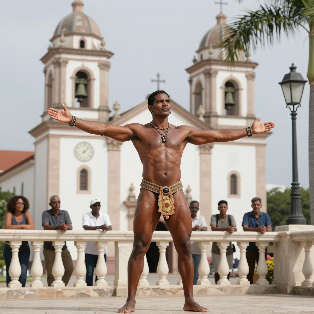 Photograph of a group of men performing a ritual on a boat. Central figure flips upside down, holding bamboo poles. Pink mast in background. Men in white shirts, one shirtless with hat. Blue sky, clouds. Various foods on table. 9 men. Intense expressions on shirtless man and man flipping upside down. Wooden structure on right.