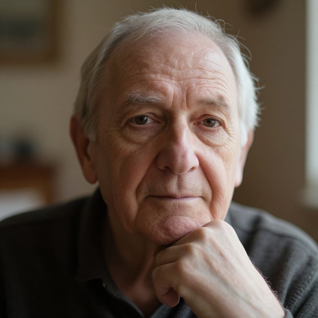 Close-up photograph of an elderly man with light gray hair, wrinkled skin, brown eyes, and a neutral expression, wearing a dark shirt against a