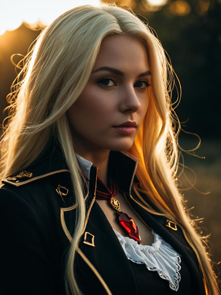 Close-up portrait of a young Caucasian woman with long blonde hair dressed as Shalltear Bloodfallen from the anime series 'Overlord'. She is wearing a black military-style jacket with gold trim and a white ruffled blouse underneath, accessorized with a large red gemstone pendant. The photo is taken outdoors during golden hour, creating warm lighting on the subject.
