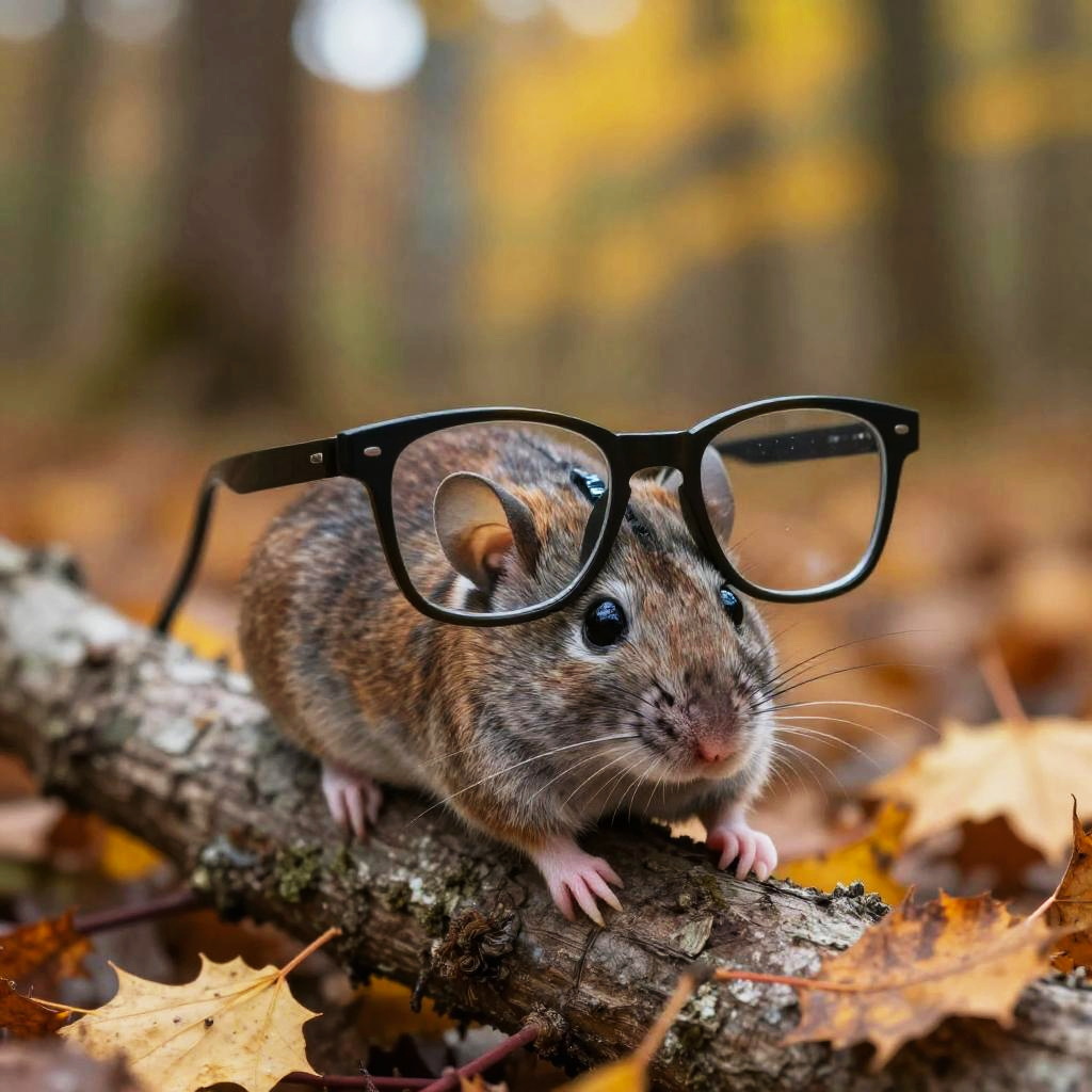 Raton con lentes, realistic mouse wearing stylish modern eyeglasses, perched on a tree branch filled with autumn leaves, soft sunlight filtering through, highly detailed fur and eye reflections, natural forest environment.
