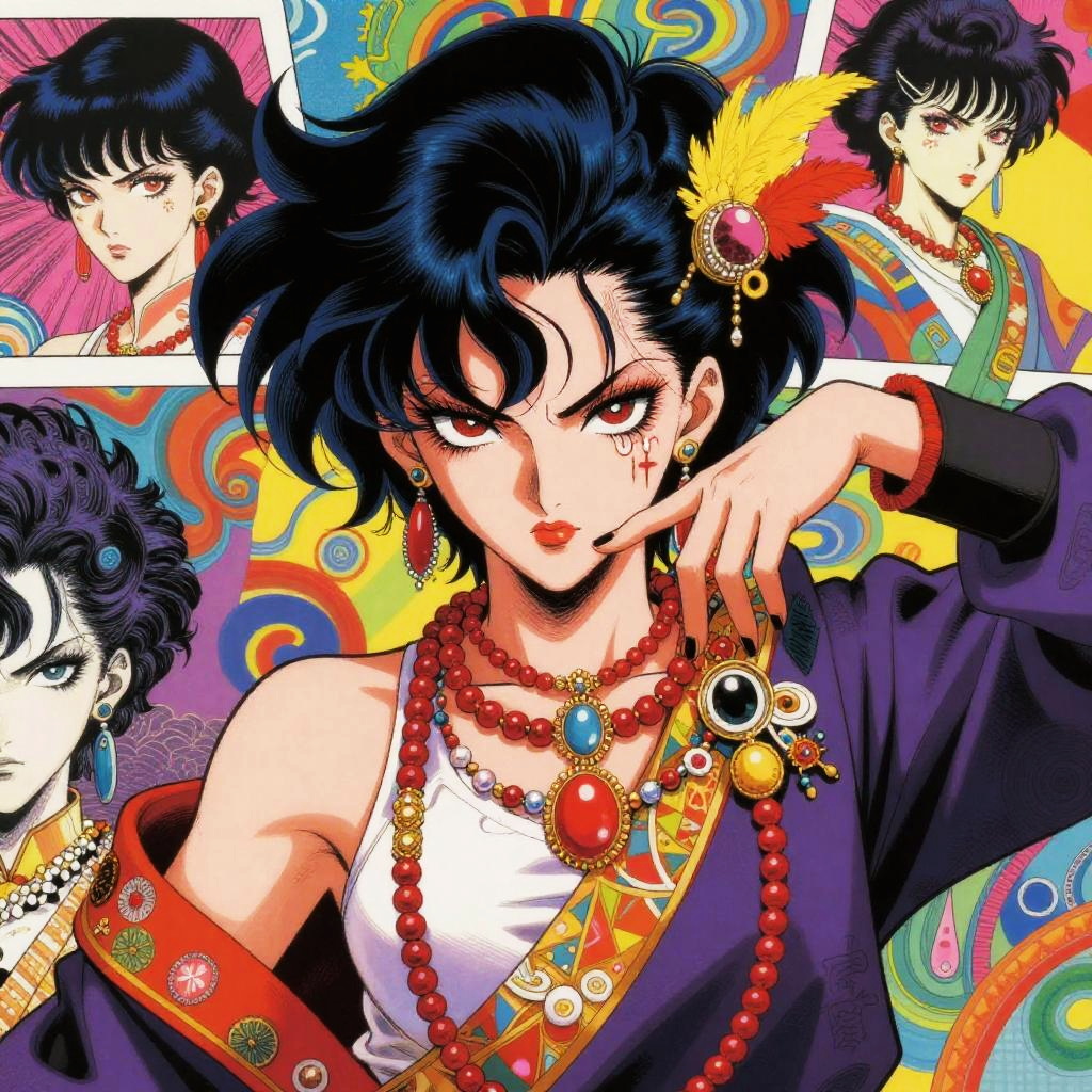Vibrant anime-style illustration of a black-haired woman with red eyes, wearing elaborate jewelry, colorful outfit, and feather accessory, set against a psychedelic