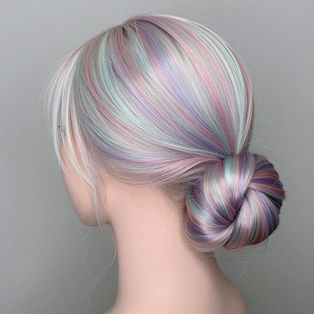 Photograph of a close-up view of an individual's head showcasing short, straight, and sleek white hair with subtle silver highlights. The hair is well-groomed, with smooth, shiny strands that reflect light. The background is softly blurred, featuring indistinct dark and light colors, likely indicating an indoor setting. The focus is entirely on the hair, highlighting its texture and color. The lighting emphasizes the brightness and cleanliness of the white and silver hues. The photograph captures the fine details of the hair strands, showcasing its healthy and well-maintained condition.