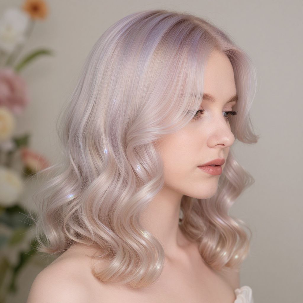 Close-up macro shot of white hair bob cut strands, detailed texture with silver sheen, natural light creating subtle shadows, styled with gentle waves, soft warm background with blurred elements to emphasize hair detail.