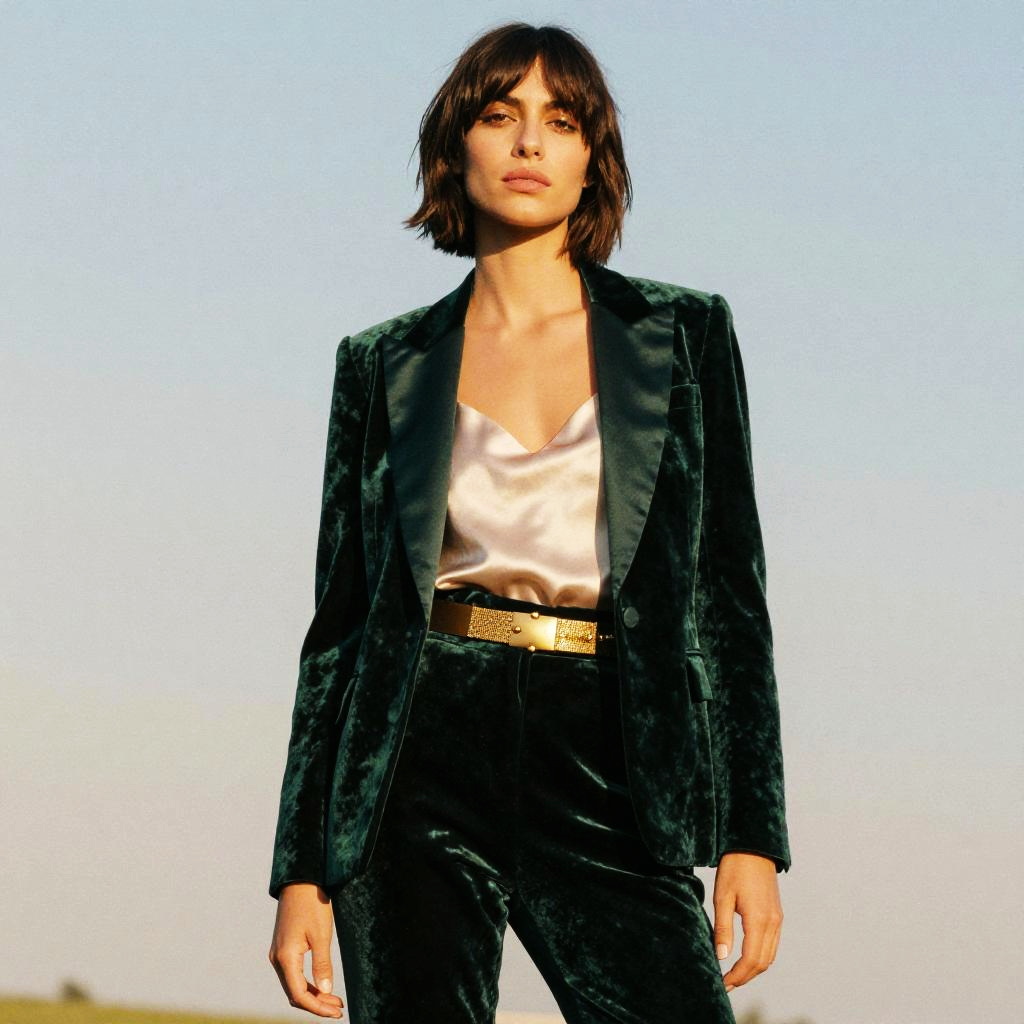 Portrait of a slim woman with long wavy hair wearing a ruby red asymmetrical velvet dress paired with a matching velvet bolero jacket. The cinematic lighting emphasizes the vintage style and rich texture of the outfit against a dark, moody background.