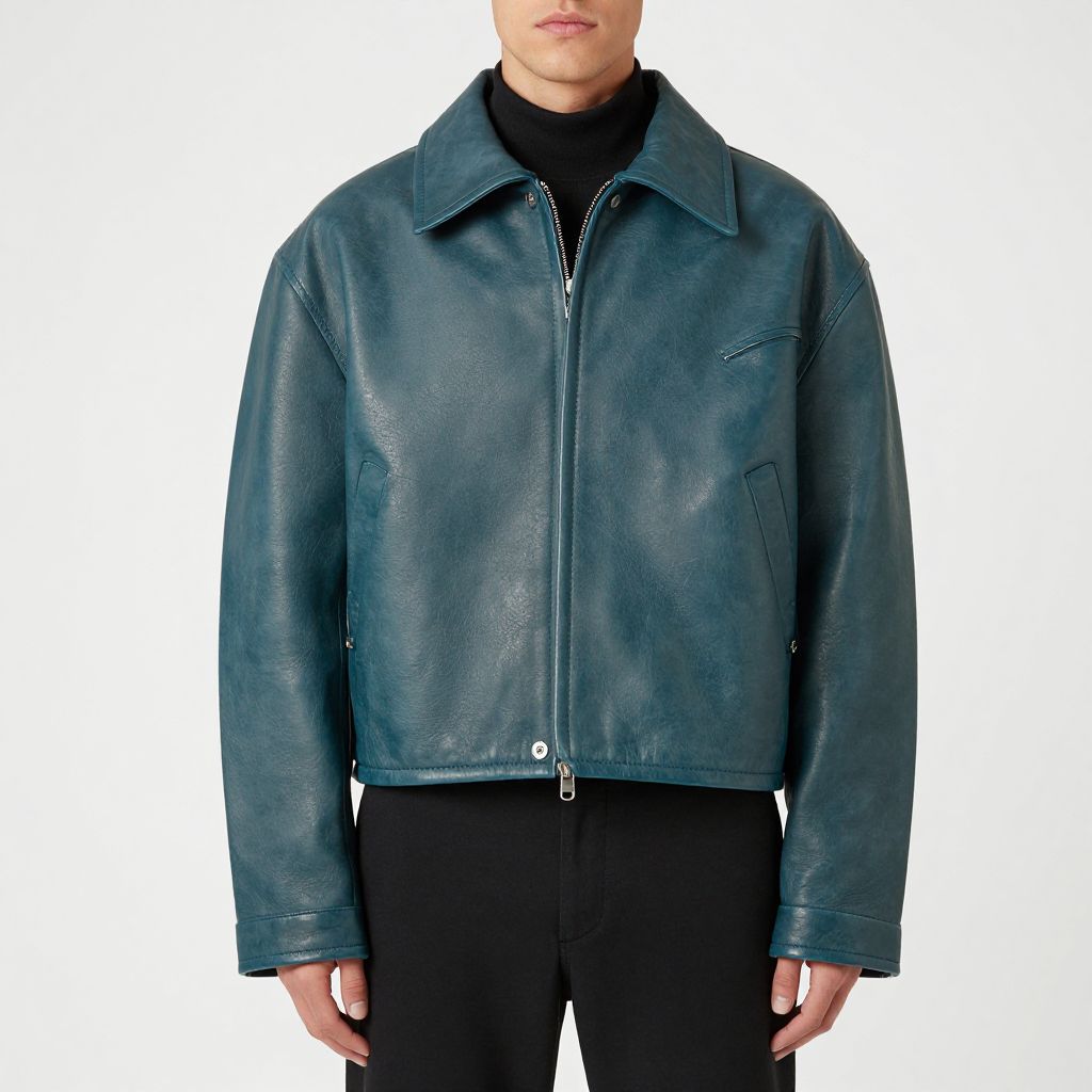 An award - winning photo of a male model wearing a cropped baggy teal distressed medieval leather menswear harrington jacket by issey miyake, 4 k, studio lighting, wide angle lens