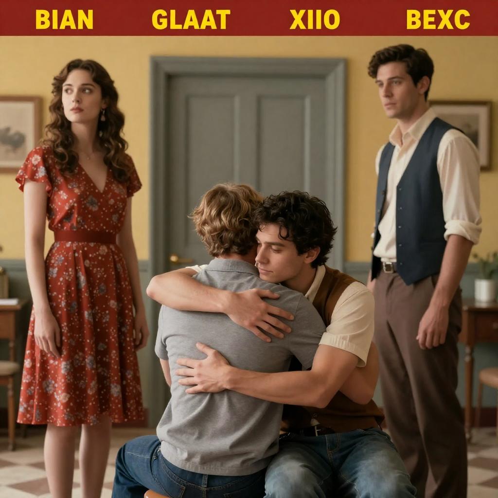 Movie poster with four people in a room. Two men sitting and hugging in the center, one with light hair and one with dark hair. One woman with curly brown hair and red floral dress stands to the left, looking away. One man with dark hair and vest stands to the right, looking at the hugging men. Yellow wall background, gray door, checkered floor. Top border has names in red and yellow .