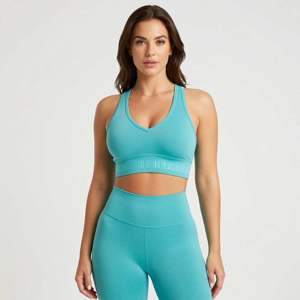 "Woman, activewear, matching set in turquoise, sports bra with V-neckline, racerback design, wide supportive underbust band with brand name, high-waisted leggings, seamless construction, plain design, body-hugging silhouette, studio background with a plain white backdrop.. Sexy. Pretty face and beаutiful eyes. Big breasts."