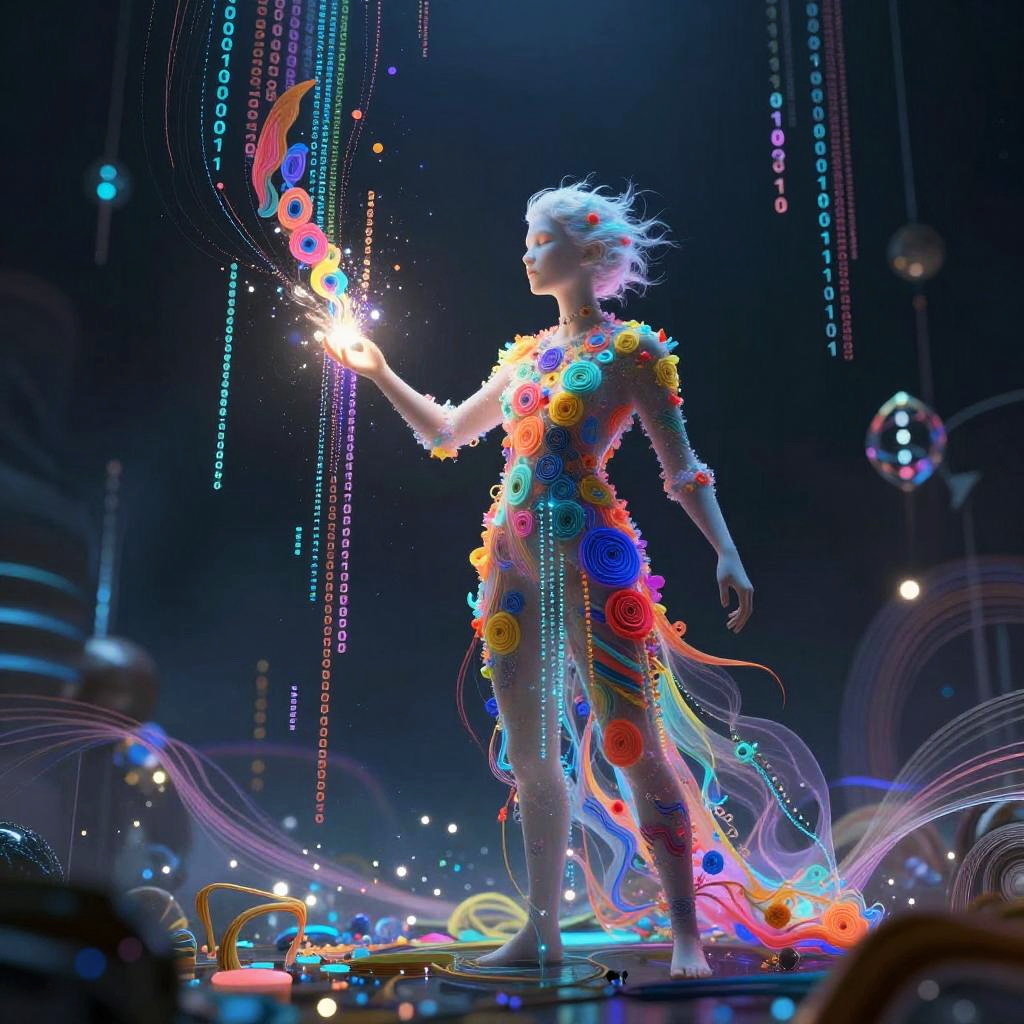 AI text to art free scene showing an ethereal AI entity conjuring colorful artistic creations from streams of binary code and text fragments, set within a mystical digital realm filled with floating pixels, light trails, and abstract geometric patterns, highly detailed and immersive