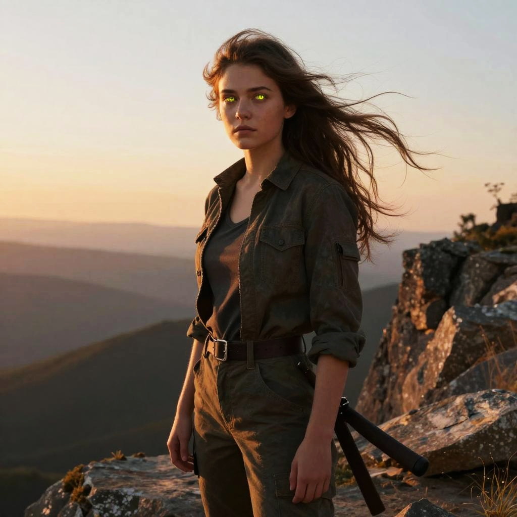 Photorealistic digital art of a determined young woman with glowing green eyes, wearing a dark military-style outfit, standing on a rocky mountain peak at sunset