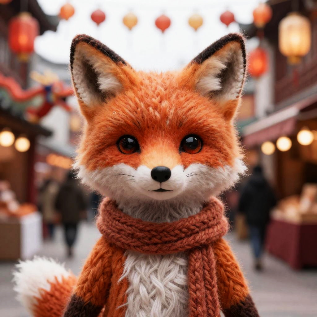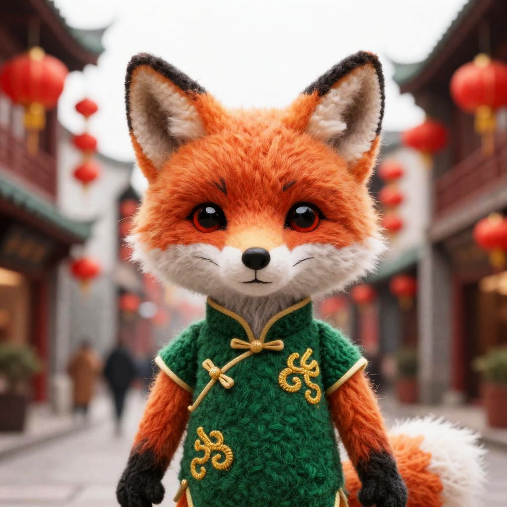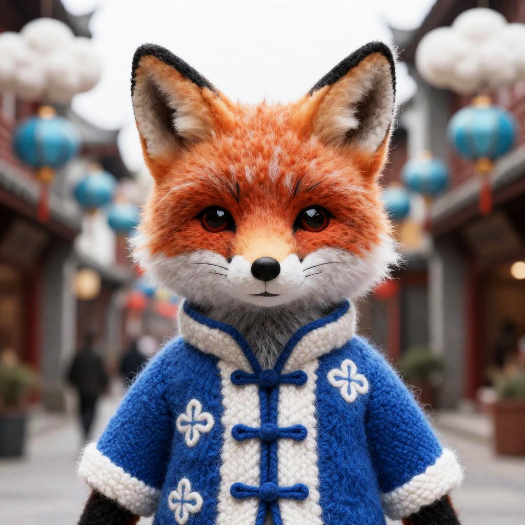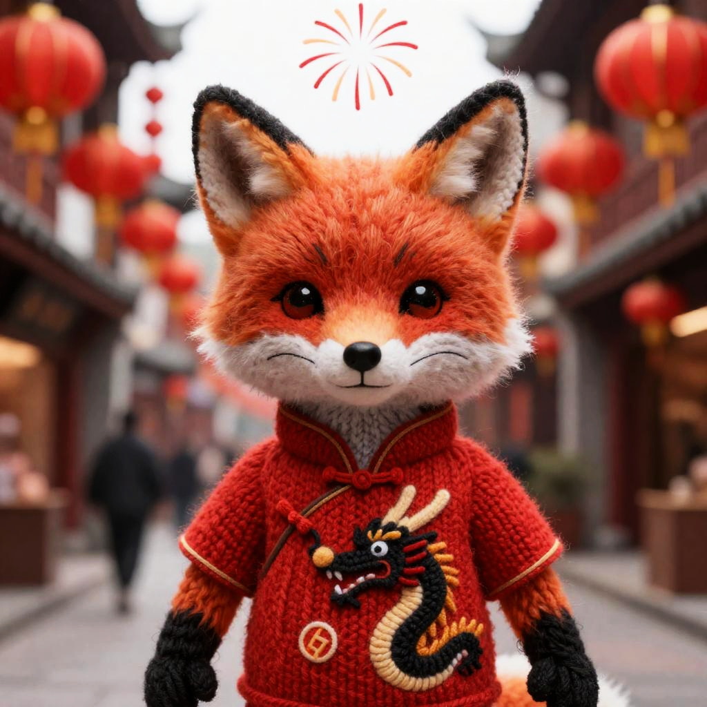 W00len, a hyper realistic macro close up picture of Fox made out of wool and yarn, wearing a yarn outfit, red and black dragon embroidered cheongsam, chinatown yarn street with vibrant red lanterns and yarn fireworks