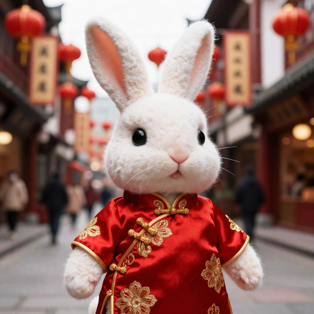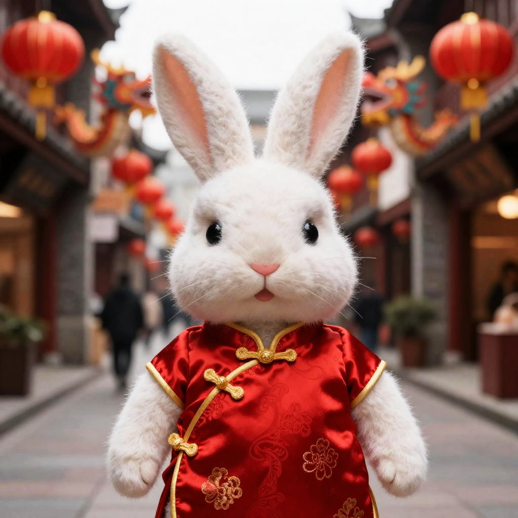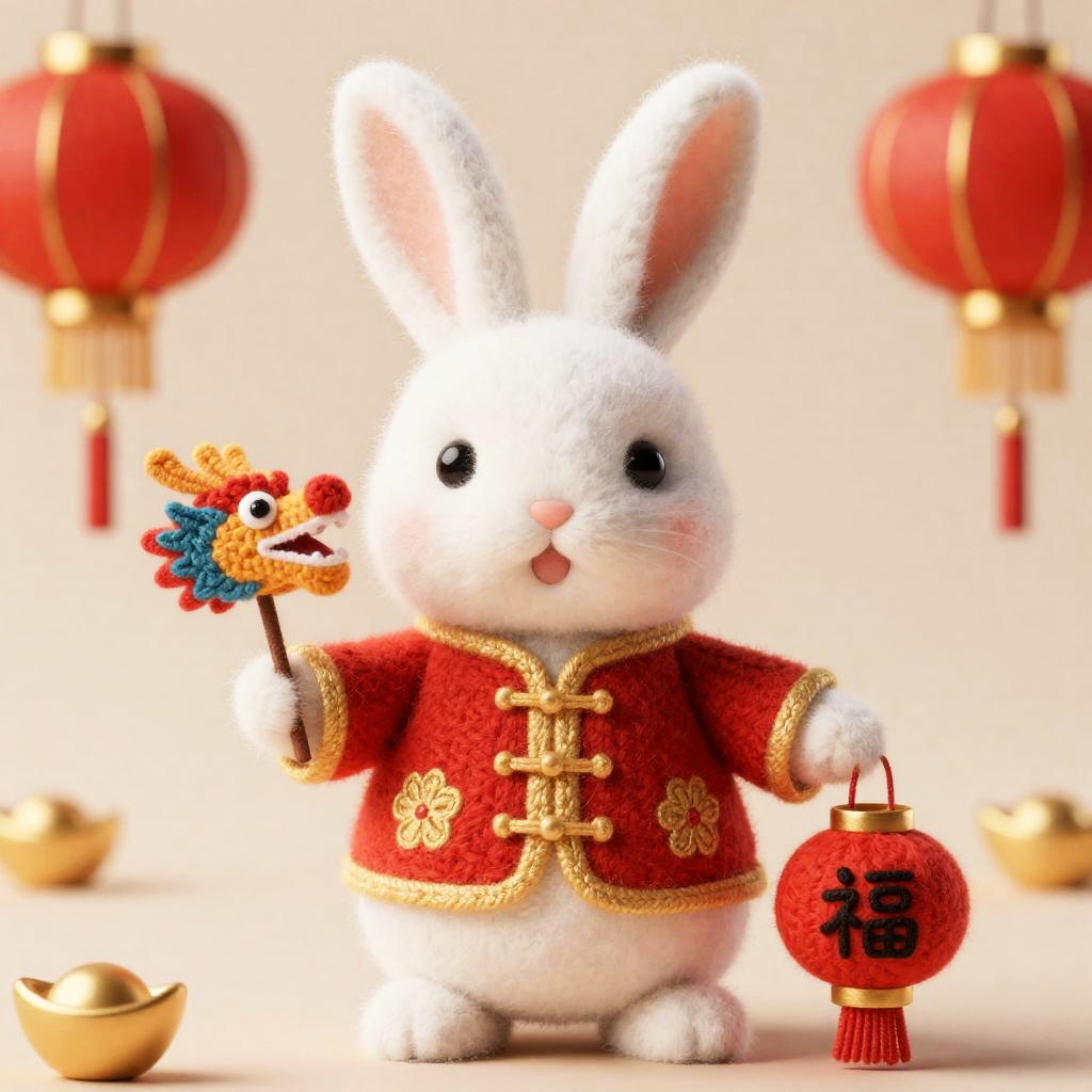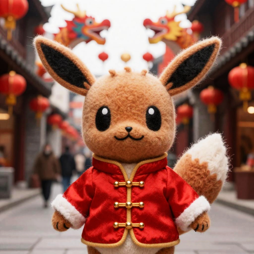 W00len, a hyper realistic macro close up picture of Fox made out of wool and yarn, wearing a yarn outfit, red and black dragon embroidered cheongsam, chinatown yarn street with vibrant red lanterns and yarn fireworks