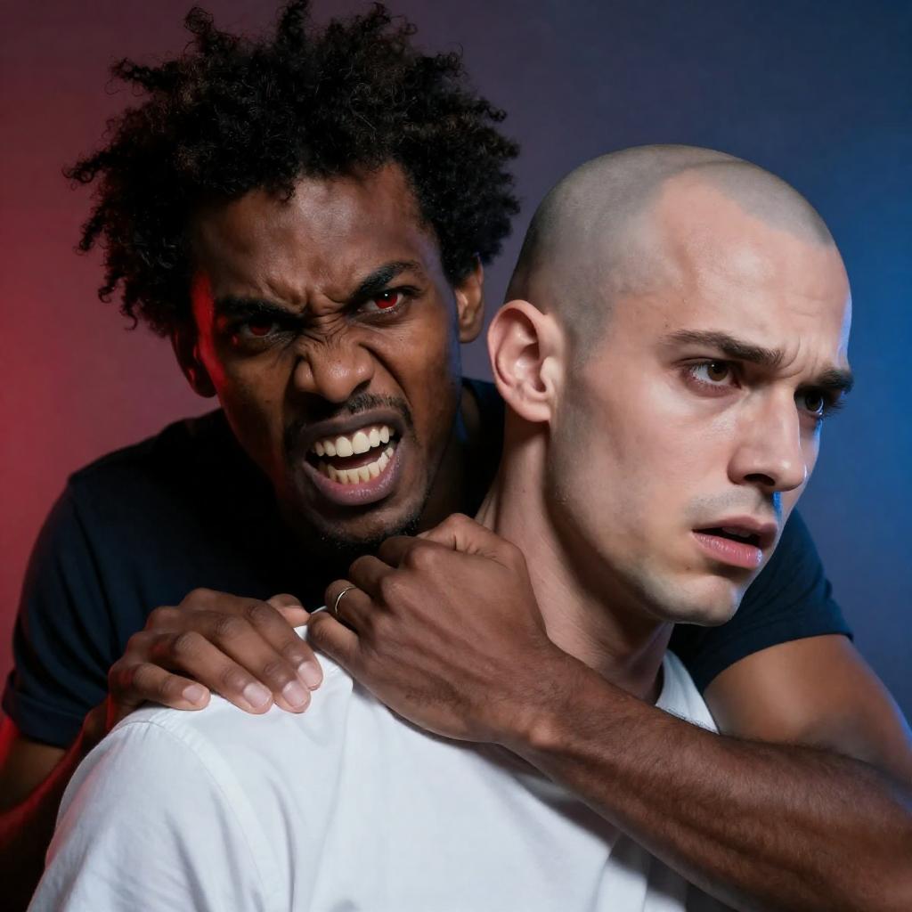 Photograph of two men, dark-skinned, intense close-up. Angry man with wild hair, red eyes, open mouth, sharp teeth, gripping white-shirted bald man's shoulder. Background has red and blue gradient. Bald man's face shows fear.