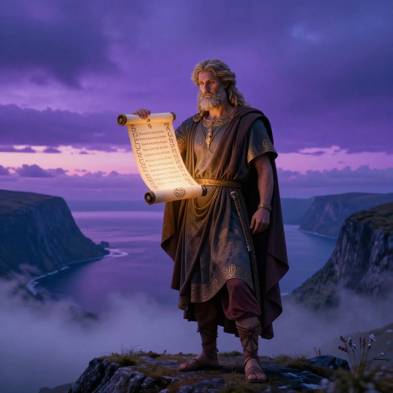 An artistic representation of Forsetti, the god of mediation, holding a glowing scroll of laws surrounded by ancient runes, standing atop misty hills with fjords and a vast ocean in the distance, dusk sky awash with vibrant purples and blues.